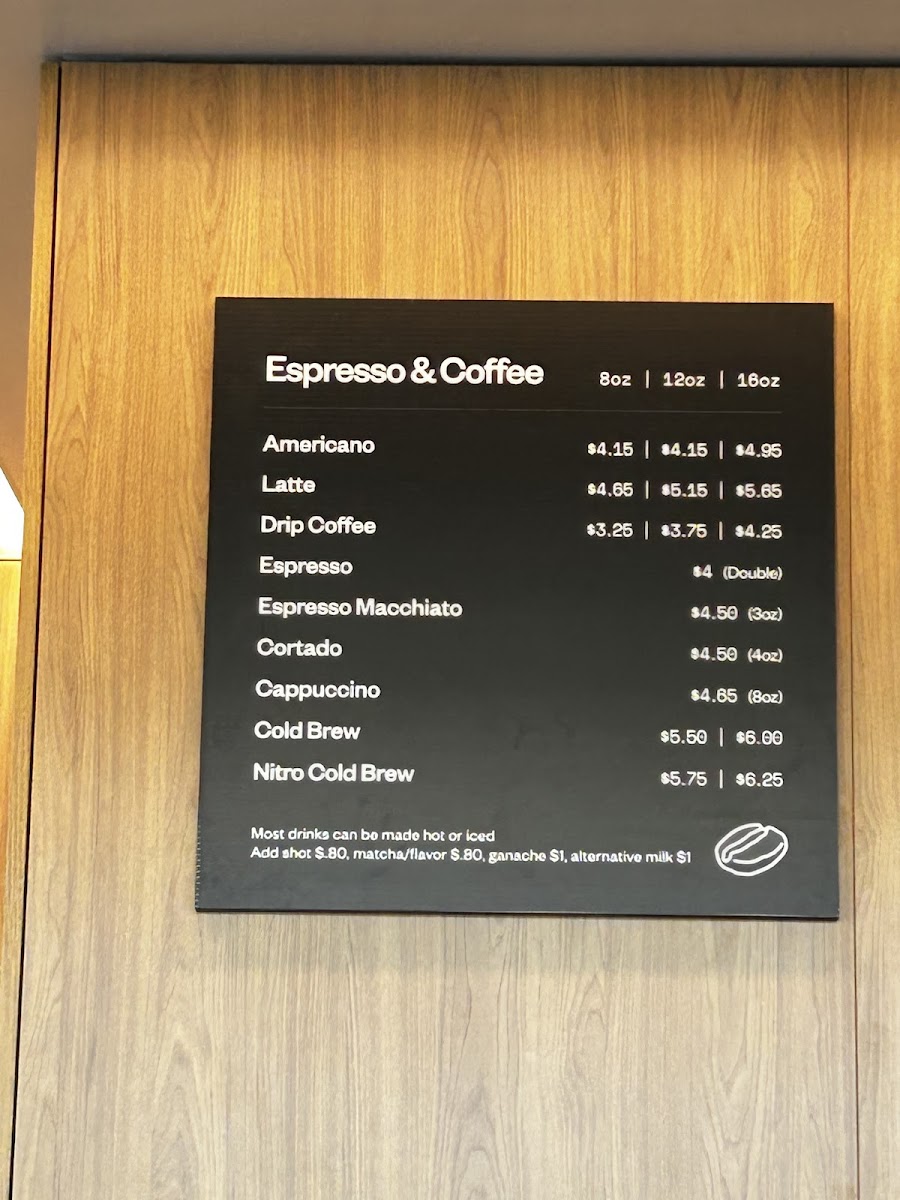 Espresso & Coffee: This section includes classic and specialty coffee drinks such as Americano, Latte, Drip Coffee, Espresso, Espresso Macchiato, Cortado, Cappuccino, Cold Brew, and Nitro Cold Brew. Portions and pricing vary to accommodate different preferences for hot or iced coffee beverages.