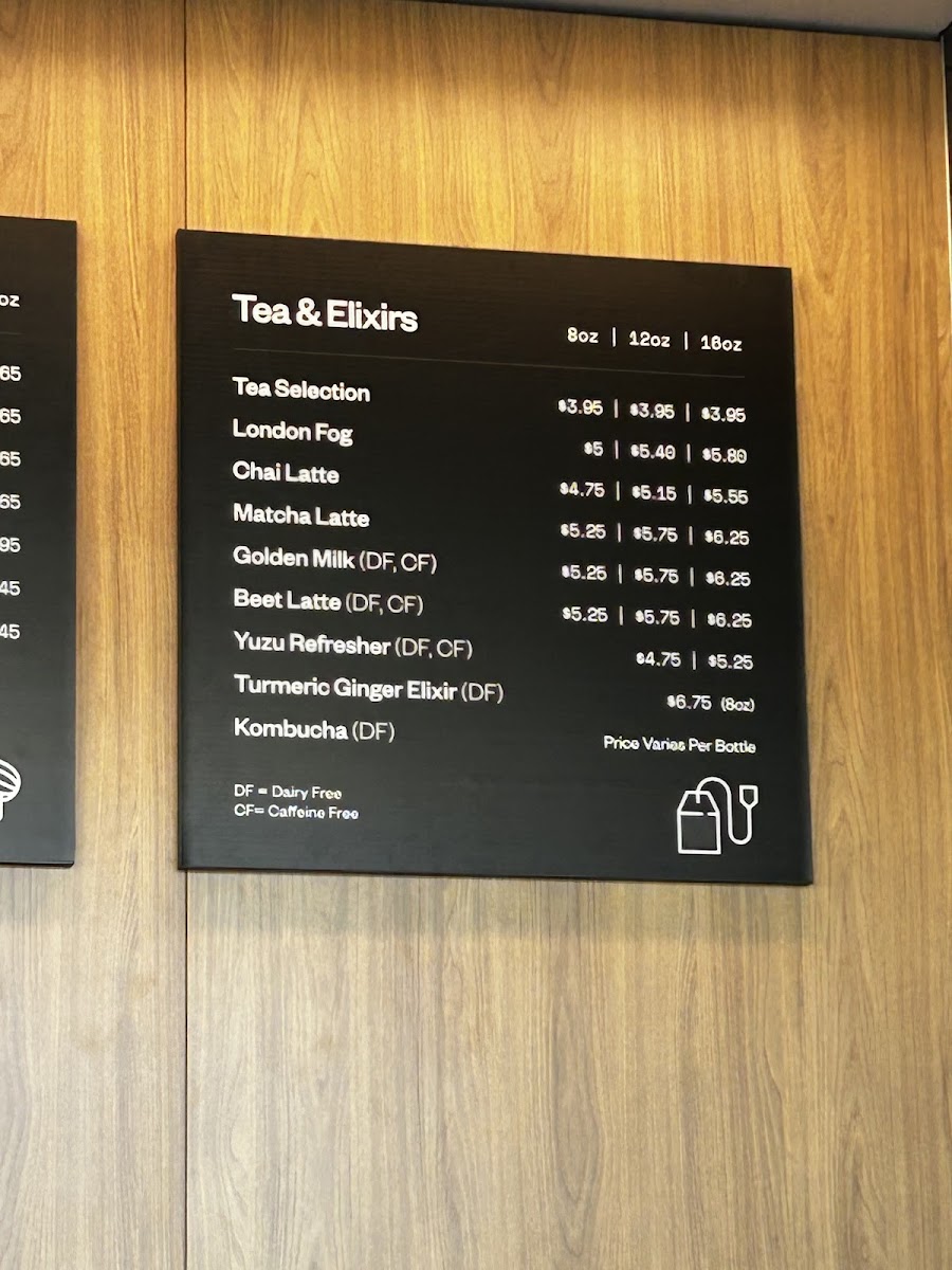 Tea & Elixirs: This group offers a selection of teas and specialty elixirs, including London Fog, Chai Latte, Matcha Latte, Golden Milk, Beet Latte, Yuzu Refresher, Turmeric Ginger Elixir, and Kombucha. These options provide both traditional and wellness-focused beverages.